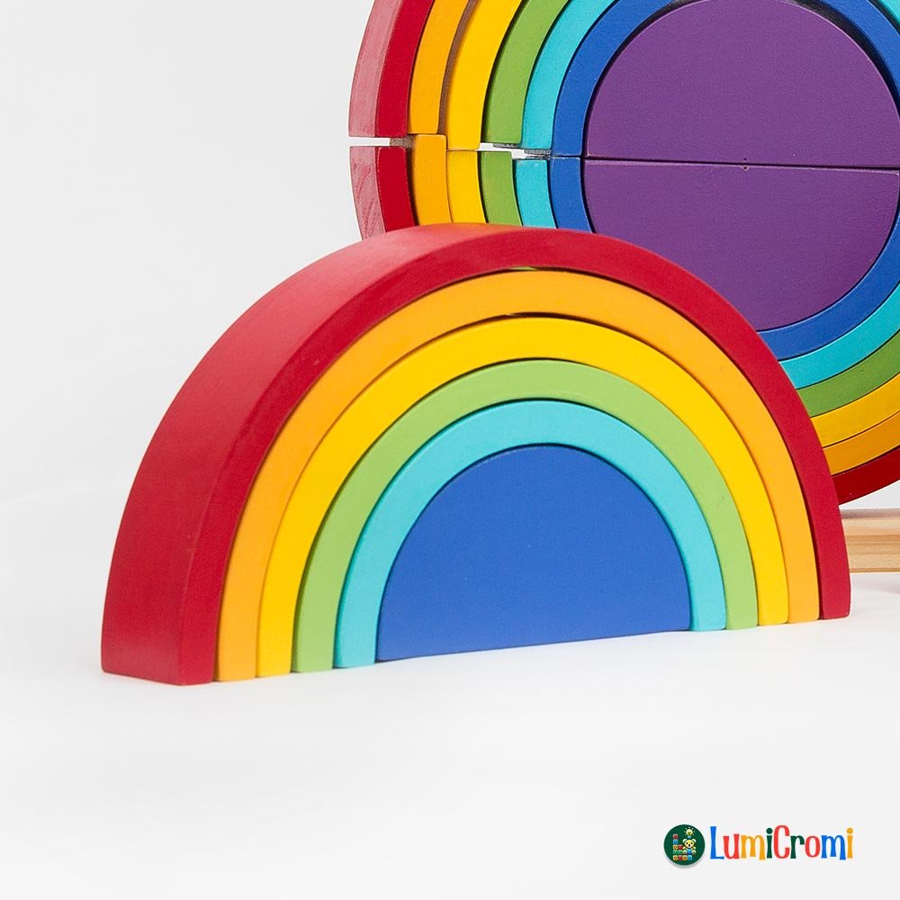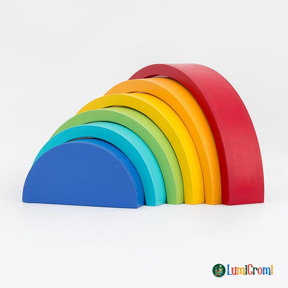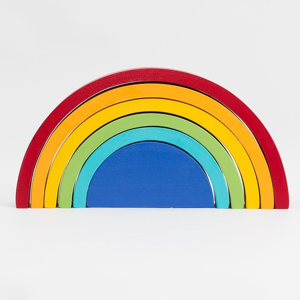 El clásico Arcoíris de Madera es un juguete versátil y lleno de posibilidades. Sus seis piezas encastrables pueden convertirse en puentes, túneles, torres, montañas o casas para muñecos. Cada forma despierta la creatividad y el juego simbólico, mientras los pequeños desarrollan equilibrio, paciencia y coordinación.