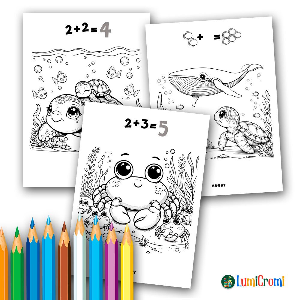 Cada página propone una operación matemática simple (sumas, restas y desafíos visuales) que los niños deben resolver antes de colorear la escena.