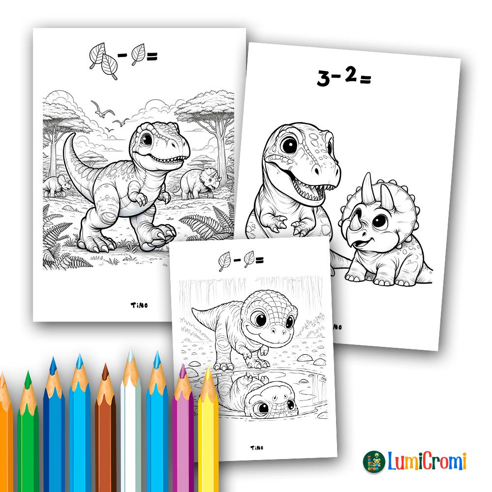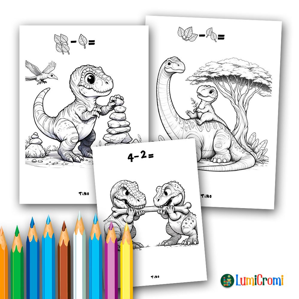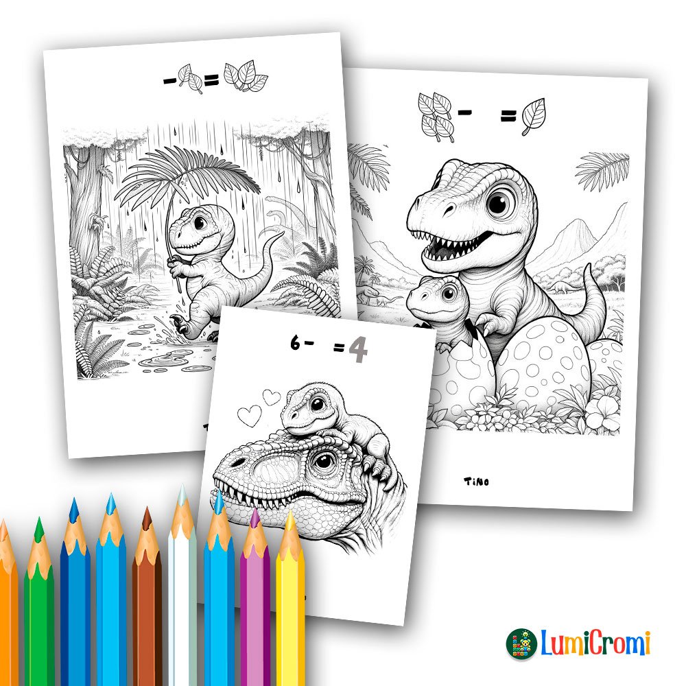 Cada página propone actividades matemáticas (sumas, restas y desafíos visuales) que los niños resuelven antes de colorear paisajes jurásicos llenos de diversión.